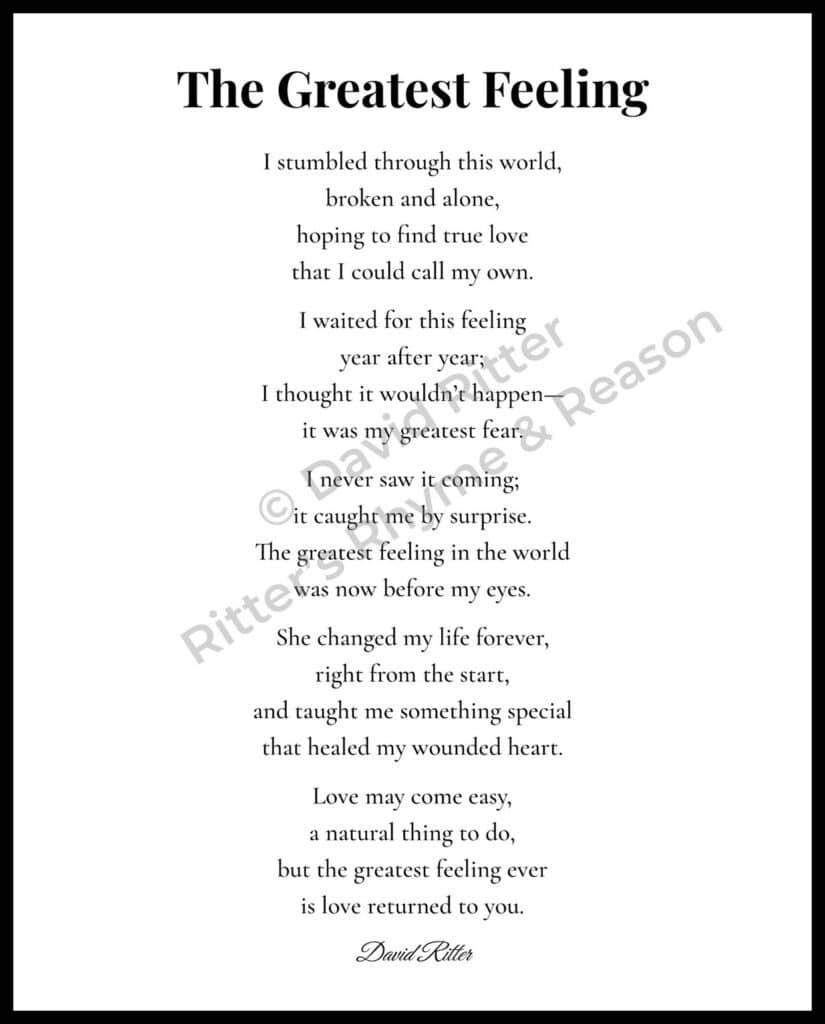 “The Greatest Feeling” is a tender reflection on finding love after heartbreak. This touching poem by David Ritter captures the joy, gratitude, and healing that come with discovering a love that feels heaven-sent.